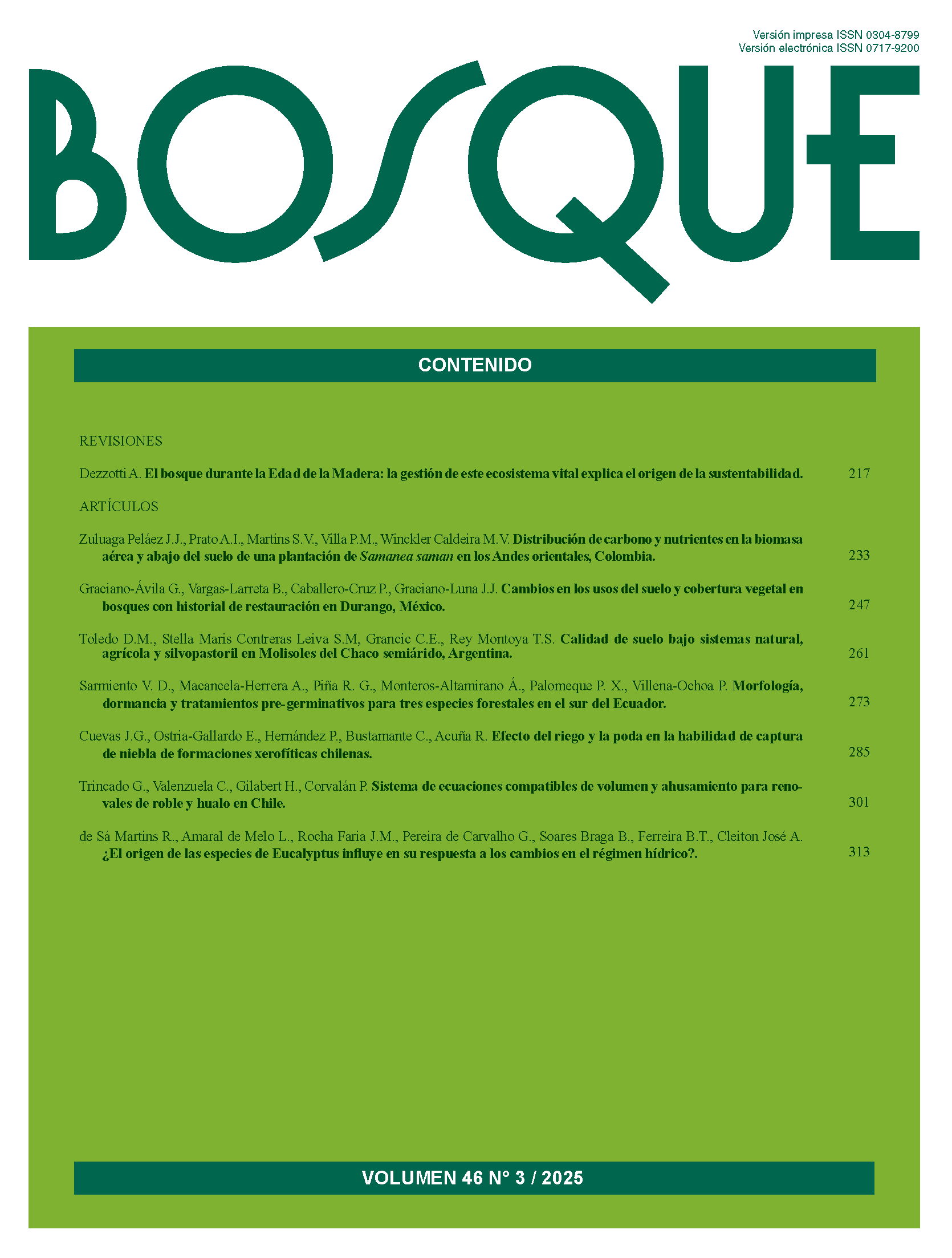 El eucalipto se ha cultivado en todo el mundo debido a su buena adaptabilidad a diferentes condiciones climáticas y su facilidad de uso en programas de fitomejoramiento. Sin embargo, el estrés ambiental como la sequía es inevitable, afectando el rendimiento de este cultivo y haciendo que la búsqueda de genotipos más adaptados a estas situaciones sea de suma importancia. El objetivo de este estudio fue caracterizar las respuestas fisiológicas de plantas jóvenes en seis especies de Eucalyptus que se originaron en ambientes contrastantes y luego las sometieron a diferentes regímenes hídricos. Para ello, se trasplantaron plántulas de 180 días a macetas, donde se mantuvieron durante 85 días en un invernadero. Después de la adopción de regímenes hídricos que constan de 40, 60 y 80% de capacidad de campo (FC), se analizaron: fotosíntesis neta (A), transpiración (E), conductancia estomática (gs) y potencial hídrico (Ψw). Hubo reducciones en A, E, gs y Ψw para todas las especies a medida que se intensificó el estrés hídrico. Con 40% FC, E. tereticornis fue la única en la que se produjo la muerte de la planta. Entre las seis especies de Eucalyptus, E. saligna fue la más tolerante al estrés hídrico seguida por E. urophylla y E. camaldulensis, mientras que E. tereticornis fue la más sensible, precedida por E. brassiana y E. grandis. El estudio comparativo interespecífico permitió identificar las especies más contrastantes en términos de tolerancia al estrés hídrico, apoyando los estudios dirigidos a la obtención de clones tolerantes a la sequía.